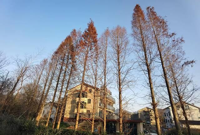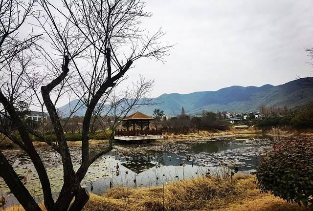 走上大坝,只见:一湖净水怀抱在群山之中,冬日的暖阳照耀在湖面上,折射出粼粼波光,四周的山峦并不高,风突出山脊、掠过湖面,使得坦然的水面上泛起了阵阵震动;走在环湖木栈说念上,风过一吹,体感有点寒凉。在这里,亭台依翠在湖畔岸边,在这里,农舍掩映在竹林之间,有着一种“曲径通幽,小阑斜护,还有水天黄昏东说念主家。”的情境,也有着一份“曲径通幽处,禅房花木深。山光悦鸟性,潭影空东说念主心。”的意韵,只是缺了禅房,少了钟声,能悟会到“万籁此都寂”,却听不见“但余钟磬音”。