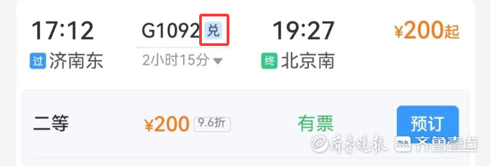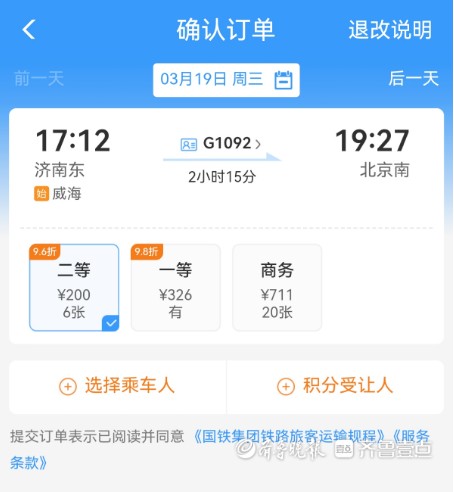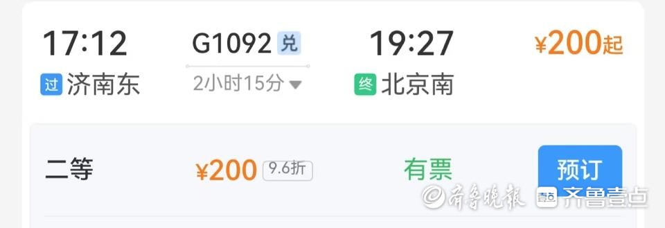 济南东站至北京南站G1092次列车二等座车票,需要有20000分。