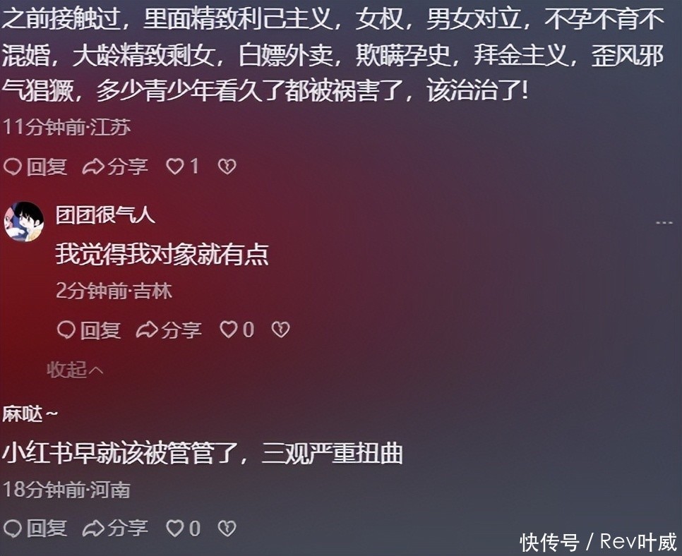这些扭曲的言论在小红书上宣传的是贞洁光明,和主流的价值不雅以火去蛾中。