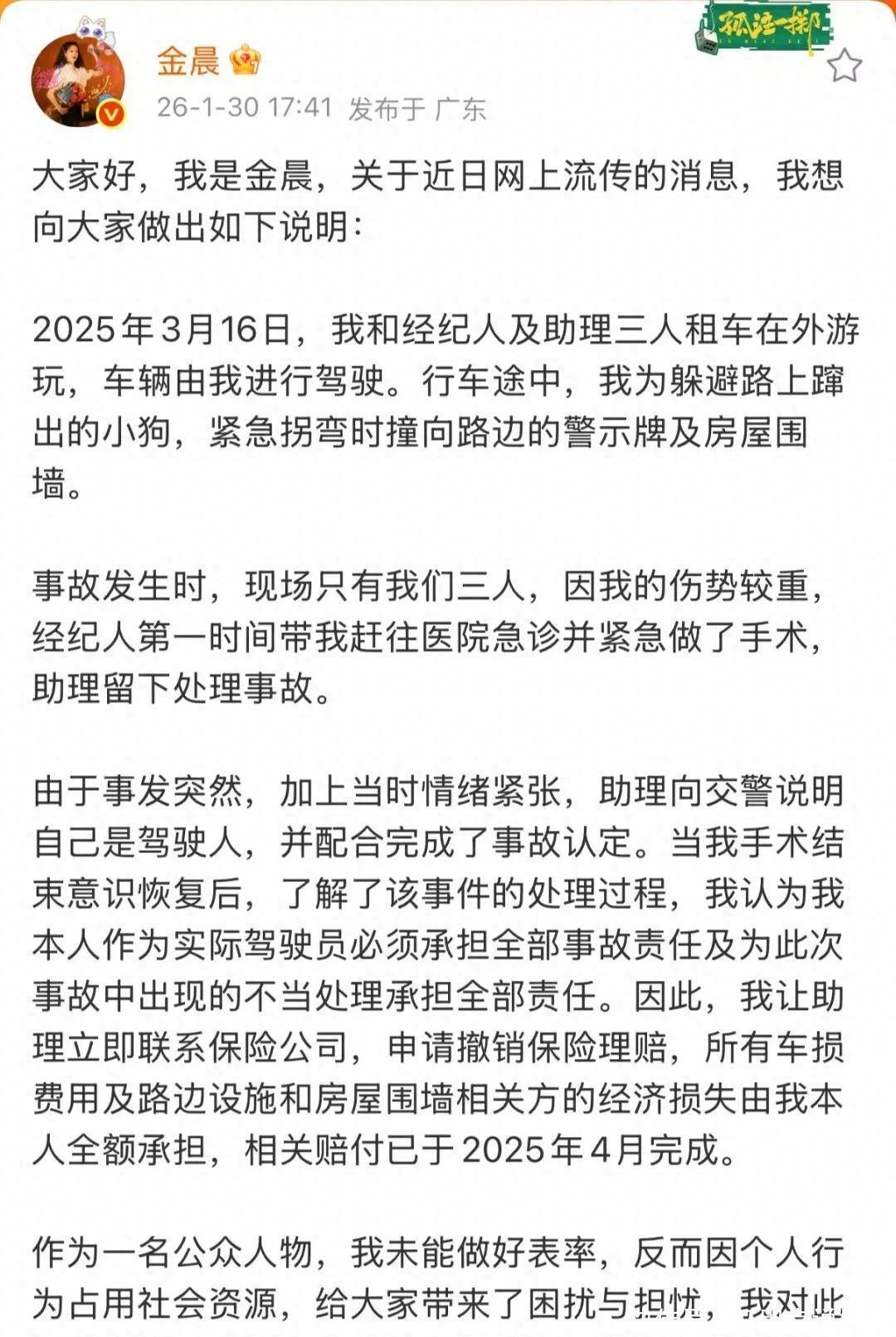 刚刚,金晨发文,防卫讲解这次交通事故的前因效果:民众好,我是金晨,对于近日网精良传的音尘,我思向民众作念出如下讲明:2025年3月16日,我和牙东谈主及助理三东谈主租车在外游玩,车辆由我进行驾驶。行车途中,我为侧目路上蹿出的小狗,繁重拐弯时撞向路边的警示牌及房屋围墙。事故发生时,现场唯有咱们三东谈主,因我的伤势较重,牙东谈主第一时代带我赶往病院急诊并繁重作念了手术,助理留住处罚事故。由于事发霎时,加上其时厚谊病笃,助理向交警讲明我方是驾驶东谈主,并合营完成了事故认定。当我手术末端意志复原后,了解了该事件的处罚经过,我以为我本东谈主算作实质驾驶员必须承担一齐事故背负及为这次事故中出现的失当处罚承担一齐背负。因此,我让助理立即关系保障公司,恳求铲除保障理赔,统共车损用度及路边按序和房屋围墙有关方的经济亏本由我本东谈主全额承担,有关赔付已于2025年4月完成。算作又名公世东谈主物,我未能作念好轨范,反而因个东谈主行为占用社会资源,给民众带来了困扰与担忧,我对此深感汗下。感谢民众的关怀与监督,我会真切反省,今后一定愈加严格顺从交走漏序,严慎注意,切实承担起应尽的社会背负。再次诚笃致歉。