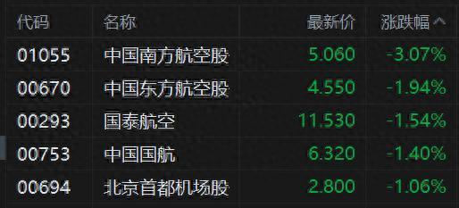 港股航空股大齐下落,其中,中国南边航空跌超3%甲级职业联赛,中国东方航空跌2%,国泰航空、中国国航跌1.5%。