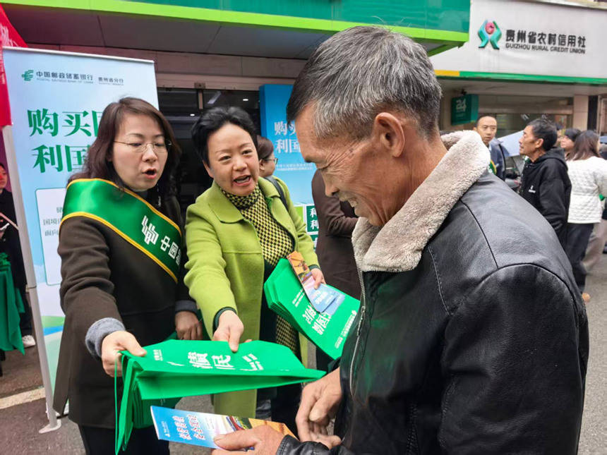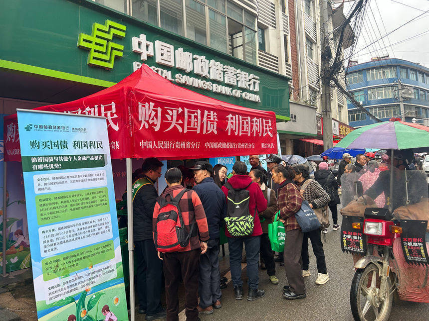 日前,中国东谈主民银行贵州省分行集合中国邮政集团有限公司贵州分公司、中国邮政储蓄银行贵州省分行,在邮储银行楠木渡买卖所门前共同开展“购买国债 利国利民”国债下乡宣传活动。