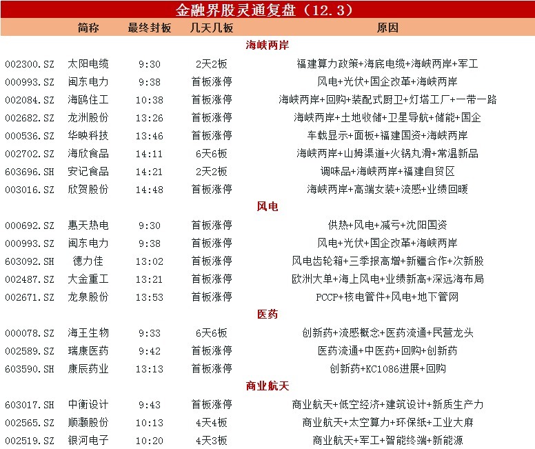 海峡两岸看法逆势活跃,太阳电缆等涨停。生意航天看法仍保管一定热度,星河电子等涨停。风电池块拉升,大金重工等涨停。