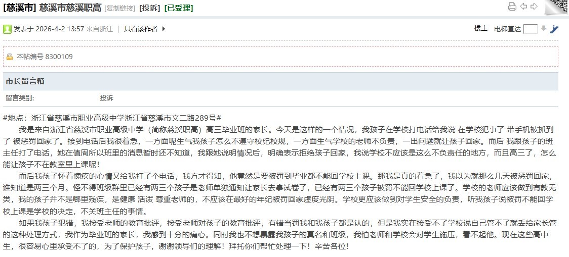 近日,网友反馈,其为浙江慈溪行状高档中学高三毕业班的家长,我方的孩子在校带手机,被罚离校回家,一直待到毕业,时候长达2个多月,质疑学校处罚过重。